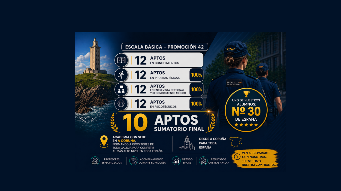 Somos un centro de formación de referencia en La Coruña para la preparacion de las oposiciones a la Fuerzas y Cuerpos de Seguridad. Contamos con amplia experiencia en la preparación y con unos recursos y materiales de primer nivel.